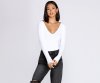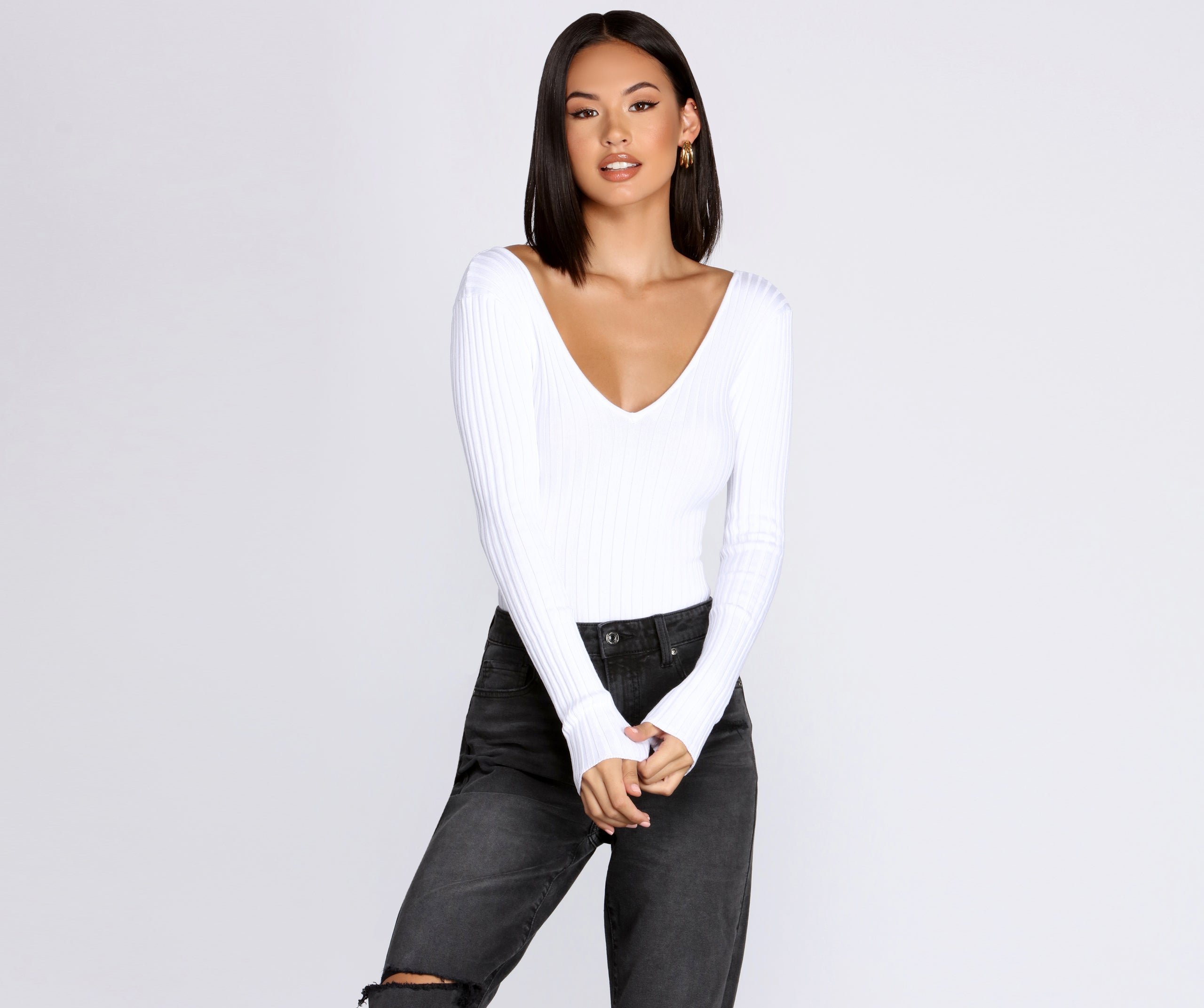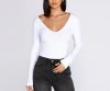 Rock a basic staple to pair with your favorite pieces! Bodysuit features a plunging V neckline, fitted long sleeves and a thong bottom with snap button closure. Bodysuit is composed of ribbed knit fabric that offers a form hugging fit with a moderate stretch.