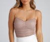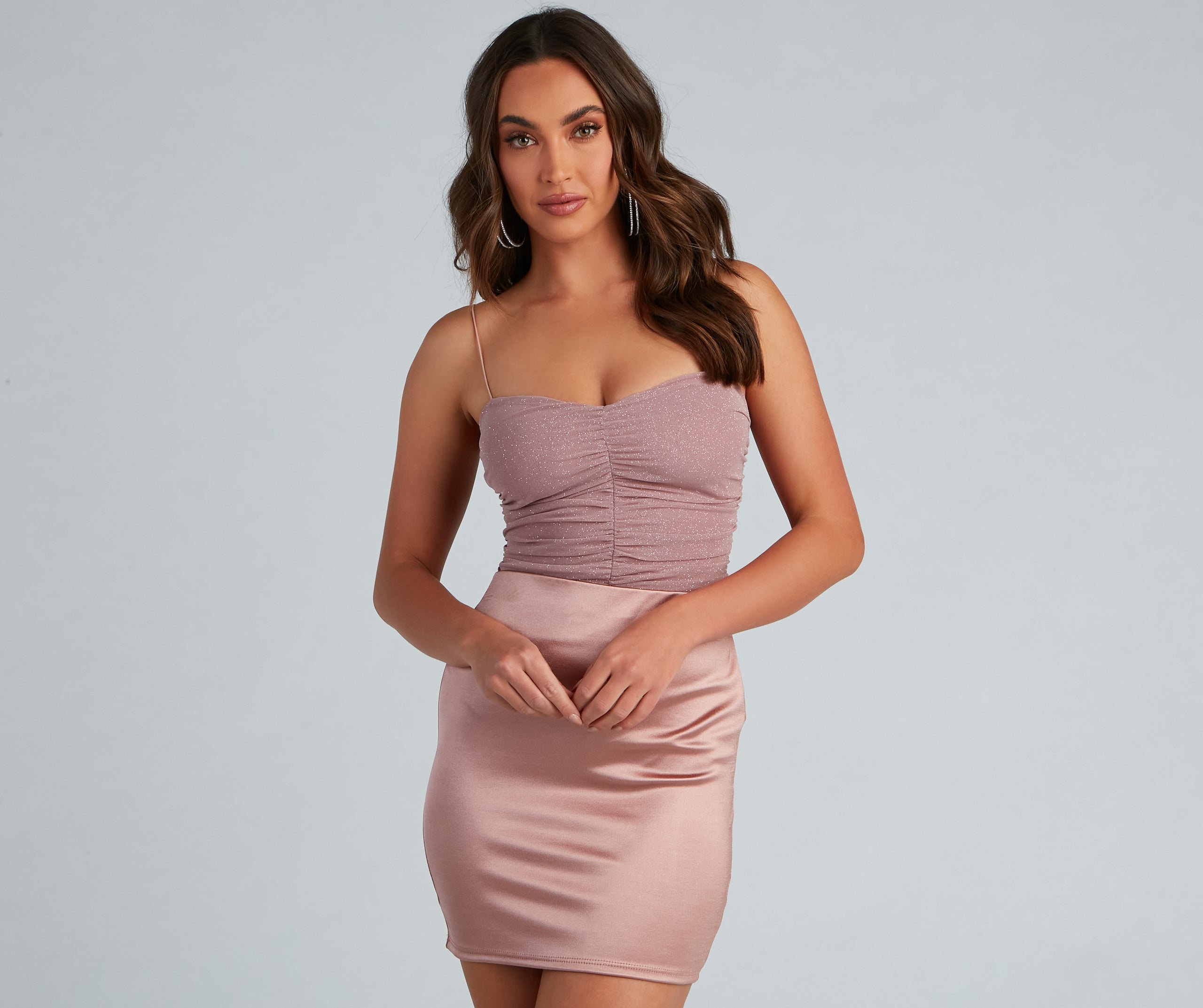 Shine bright under the lights in this glitter mesh bodysuit! It features bungee spaghetti straps, a?sweetheart neckline with a ruched front. The sheer lined knit fabric offers a moderate stretch. Complete your look with